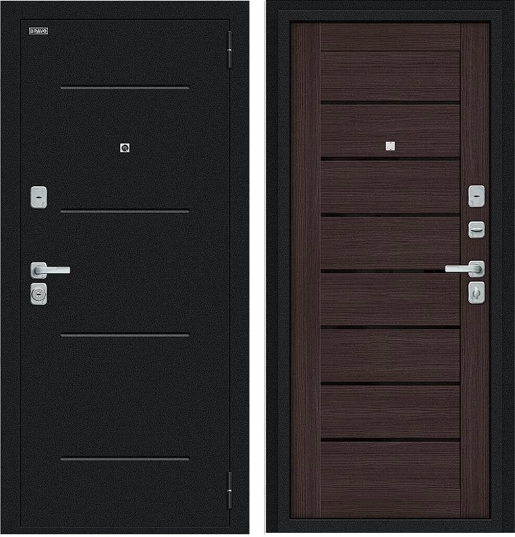 Дверь Браво Техно/BChrome Букле черное/Wenge Melinga среднего ценового диапазона. Стоит дверь 29 900 руб. и это отличное соотношение цены и качества. Модель подойдет для установки, например в новостройку. Прослужит долго и будет надежной защитой вашей квартиры или дома.